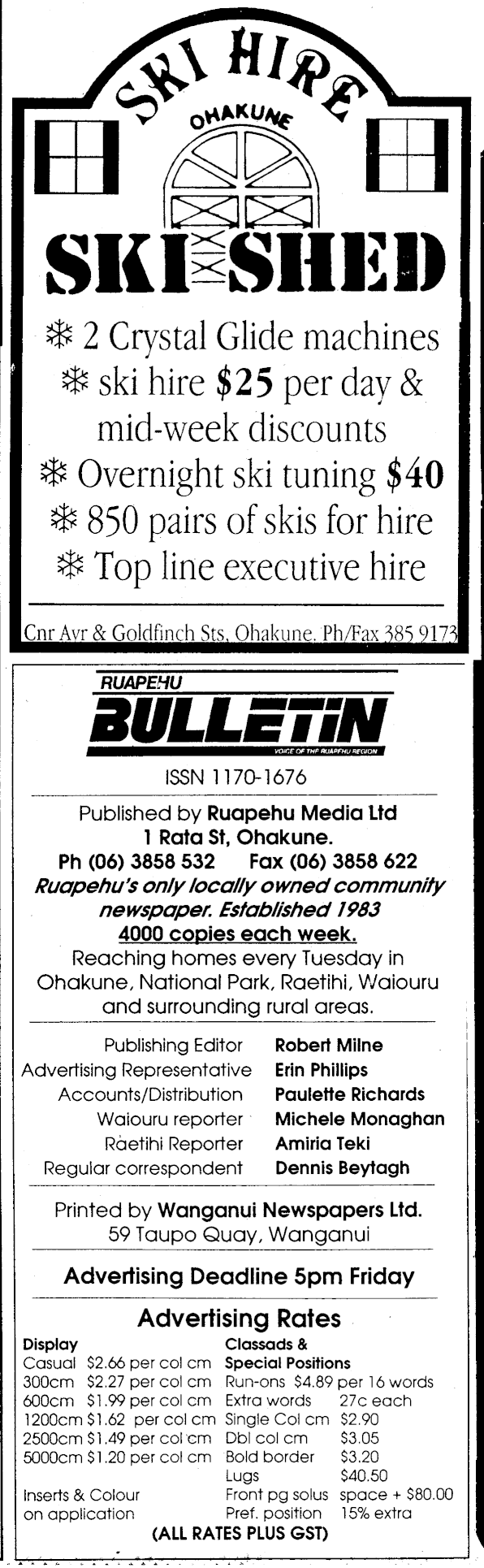 Ea fiSk Ea SKISIIEI) $ 2 Crystal Glide machines ski hire $25 per day & mid-week discounts ^ Overnight ski tuning $40 $ 850 pairs of skis for hire Top line executive hire Cni^j^GoldJfinchSts^O^ RUAPEHU BULLETiN — — — i— — — BSEw«Ka.-iVHfii^.n"Wi'd ISSN 1170-1676 Published by Ruapehu Media Ltd 1 Rata St, Ohakune. Ph (06) 3858 532 Fax (06) 3858 622 Ruapehu's only locally owned community newspaper. Estab/ished 1983 4000 copies each week. Reaching homes every Tuesday in Ohakune, National Park, Raetihi, Waiouru and surrounding rural areas. Publishing Editor Robert Milne Advertising Representative Erin Phillips Accounts/Distribution Paulette Richards Waiouru reporter Michele Monaghan Raetihi Reporter Amiria Teki Regular correspondent Dennis Beytagh Printed by Wanganui Newspapers Ltd. 59 Taupo Quay, Wanganui Advertising Deadline 5pm Friday Advertising Rates Display Classads & Casual $2.66 per col cm Special Positions 300cm $2.27 per col cm Run-ons $4.89 per 16 words 600cm $1.99 per col cm Extra words 27c each 1200cm $1.62 per col cm SingleColcm $2.90 2500cm $1 .49 per col cm Dbl col cm $3.05 5000cm $1 .20 per col cm Bold border $3.20 Lugs $40.50 Inserts & Colour Front pg solus space + $80.00 on application Pref. position 15% extra (ALL RATES PLUS GST)
