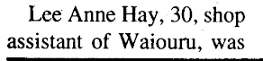 Lee Anne Hay, 30, shop assistant of Waiouru, was