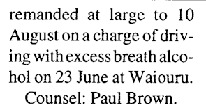 remanded at large to 10 August on a charge of driving with excess breath alcohol on 23 June at Waiouru. Counsel: Paul Brown.