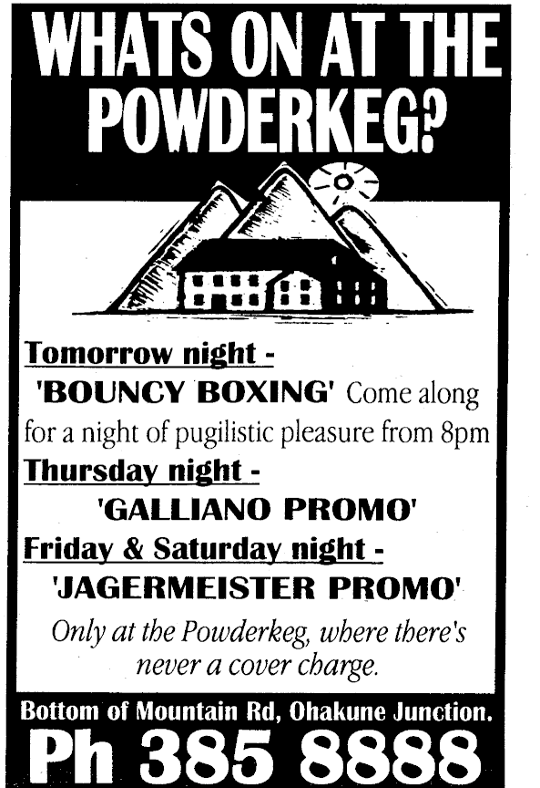Tomorrow night - 'BOUNCY BOXING' Come along for a night of pugilistic pleasure from 8pm Thursdav night - GALLIANO PROMO' Fridav & Saturday night - 'JAGERMEISTER PROMO Only at the Powderkeg, where there's never a cover charge.