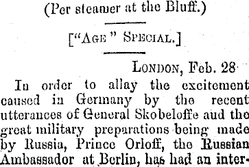 (Per steamer at the Bluff.) [“Age ” Special.] London, Feb.2B In order to allay the excitement caused in Germany by the recent utterances of General Skobeloffe aud the great military preparations being made by llussia, Prince Orloff, the [Russian Ambassador at ,Berlin, has had an inter*