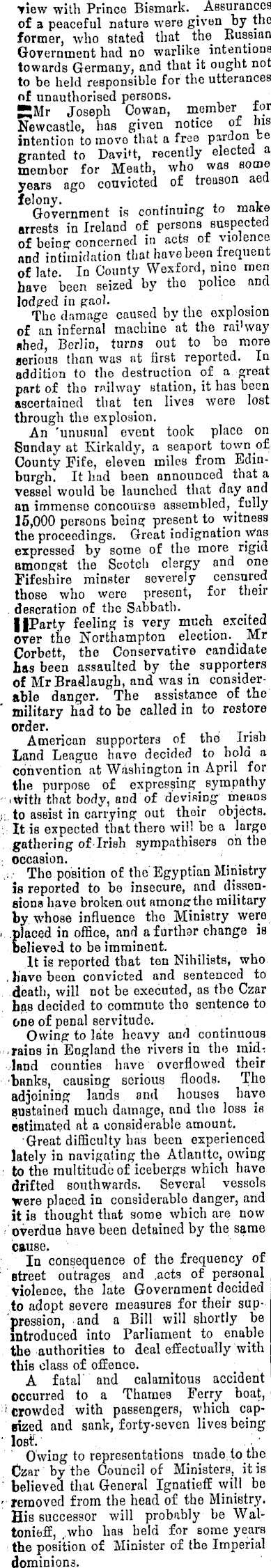 view with Prince Bismark. Assurances of a peaceful nature were given by the former, who stated that the Russian Government had no warlike intentions towards Germany, and that it ought not to be held responsible for the utterances of unauthorised persons. KMr Joseph Cowan, member for Newcastle, has given notice of ms intention to move that a free pardon be granted to Bavin, recently elected a member for Meath, who was some years ago convicted of treason aed Government is continuing to make arrests in Ireland of persons suspected of being concerned in acts of violence nod intimidation that have been frequent of late. In County Wexford, nine men have been seized by the police andlodged in gaol. The damage caused by the explosion of an infernal machine at the rai'way shed, Berlin, turns out to be more serious than was at first reported. In addition to the destruction of a great part of the railway station, it has been ascertained that ten lives were lost through the explosion. An 'unusual event took place on Sunday at Kirkaldy, a seaport town of County Fife, eleven miles from Edinburgh. It had been announced that a vessel would be launched that day and an immense concourse assembled, fully 16,000 persons being present to witness the proceedings. Great indignation was expressed by some of the more rigid amongst the Scotch clergy and one Fifeshire minster severely censured those who were present, for their , descration of the Sabbath. ||Party feeling is very much excited over the Northampton election. _ Mr Corbett, the Conservative candidate has been assaulted by the supporters of Mr Bradlaugh, and was in considerable danger. The assistance of the military had to be called in to restore order. American supporters of the Irish Land League have decided to bold a convention at Washington in April for the purpose of expressing sympathy ■‘itHth that body, and of devising’ means i;, to assist in carrying out their objects. It is expected that there will he a large gathering of lrish sympathisers on the ; occasion. ■ The position of the Egyptian Ministry is reported to be insecure, and dissensions have broken out among the military by whose influence the Ministry were i. placed in office, and a further change is believed to be imminent. It is reported that ten Nihilists, who , have been convicted and sentenced to death, will not be executed, as the Czar has decided to commute the sentence to one of penal servitude. Owing to late heavy and continuous rains in England the rivers in the midi .-land counties have overflowed their banks, causing serious floods. The adjoining lands and houses have sustained much damage, and the loss is estimated at a considerable amount. Great difficulty has been experienced lately in navigating the Atlantic, owing ; to the multitude of icebergs which have drifted southwards. Several vessels were placed in considerable danger, and it is thought that some which are now • overdue have been detained by the same cause. In consequence of the frequency of ■ street outrages and .acts of personal Violence, the late Government decided ■ to adopt severe measures for their suppression, and a Bill will shortly be introduced into Parliament to enable the authorities to deal effectually with this class of offence. A fatal' and calamitous accident occurred to a Thames Ferry boat, 'crowded with passengers, which capsized and sank, forty-seven lives being ‘ lost. Owing to representations made .to the Czar by the Council of Ministers, it is ‘ believed that General Ignafieff will be ' removed from the head of the Ministry. His successor will probably be Waltonieff, ..who has held for some years the position of Minister of the Imperial dominions.