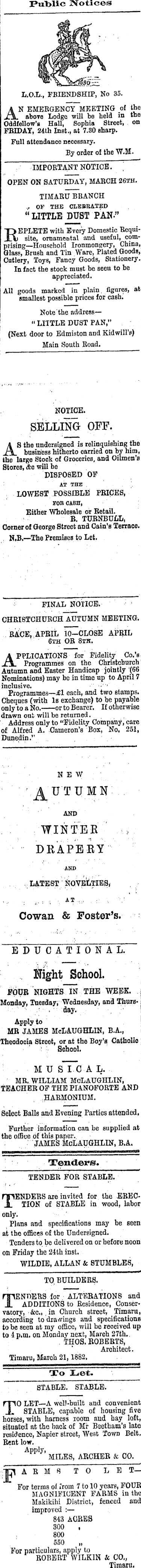 Public Notices L.0.L., FRIENDSHIP, No 35. AN EMERGENCY MEETING of the above Lodge will be held in the Oddfellow’s Hall, Sophia Street, on FRIDAY, 24th Inst., at 7.30 sharp. Full attendance necessary. By order of the W.M. IMPORTANT NOTICE. ' OPEN ON SATURDAY, MARCH 26TH, TIMARU BRANCH OF THE CLEBKATED “LITTLE DUST PAN-” REPLETE with Every Domestic Requisite, ornamental and useful, comprising—Household Ironmongery, China, Glass, Brush and Tin Ware, Plated Goods, Cutlery, Toys, Fancy Goods, Stationery. In fact the stock must be seen to be appreciated. All goods marked in plain, figures, a V smallest possible prices for cash. Note the address — " LITTLE DUST PAN,” (Next door to Bdmiston and Kidwill’s) Main South Road. NOTICE. SELLING OFF. AS the undersigned is relinquishing the business hitherto carried on by him, the large Stock of Groceries, and Oilmen’s Stores, &c will be DISPOSED OP AT THE . LOWEST POSSIBLE PRICES, FOB CASH, Either Wholesale or Retail. E. TURNBULL, Corner of George Street and Cain’s Terrace. , H.B.—The Premises to Let. PINAL NOTICE. : 1 CHRISTCHURCH AUTUMN MEETING. RACE, APRIL 10-CLOSE APRIL 6th OR Bth. A PFLICATIONS for fidelity Co.’s. Jr\ Programmes on the Christchurch: Autumn and Easter Handicap jointly (66 ■ Nominations) may be in time up to April 7 inclusive. Programmes —£ 1 each, and two stamps. Cheques (with Is exchange) to be payable only to a No, or to Bearer. If otherwise drawn out will be returned. ' Address only to “Fidelity Company, care of Alfred A. Cameron’s Box, No. 251, Dunedin.” NEW ’ ACtumn AND WINTER DRAPERY AND LATEST' NO,VEIjTIES< „ .. ■ AX . , V Cowan & Poster’s. EDUCATIONAL. , Mght School. POUR NIGHTS IN THE WEEK. . Monday, Tuesday, Wednesday, and Thurs- ’ • day. ■, , :/ Apply to mr james McLaughlin, b.a., Tbeodocia Street, or at the Boy’s Catholic School. MU sTc A L. mr. william mclaughlin, TEACHER OP THE PIANOFORTE AND .HARMONIUM. Select Balls and Evening Parties attended. Further information can be supplied at the office of this paper.. JAMES MCLAUGHLIN, B.A. Tender®. TENDER FOR STABLE. TENDERS are invited for the ERECTION of STABLE in wood, labor only. Plans and specifications may be seen i at the offices of the Undersigned. Tenders to be delivered on or before noon on Friday the 24th inst. WILDIB, ALLAN k STUMBLES, TO, BUILDERS. TENDERS for ALTERATIONS and ADDITIONS to Residence, Conservatory, &c., ,in Church street, Timaru, according to drawings and specifications to be seen at my office, will be received np to 4 p.m. on Monday next, March 27th., , THOS. ROBERTS, Architect. Timaru, March 21, 1882, To 3L©t. STABLE. STABLE. TO LET—A well-built and convenient STABLE, capable of housing five horses, with harness room and hay loft, situated at the back of Mr Beetham’s late residence, Napier street, West Town Belt. Rent low. Apply, MILES, ARCHER & CO. AR M S TO LET— For terms of from 7 to 10 years, FOUR MAGNIFICENT FARMS in the Makikihi District, fenced and improved 848 ACRES 300 , 800 550 „ For particulars, apply to ROBERT WILKIN & CO„ Timaru.