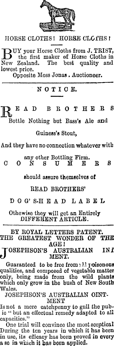 HORSE CLOTHS ! HORSE CLOTHS I BUY your Horse Cloths from J. TRIST, the first maker e£ Horse Cloths in New Zealand. The best quality and lowest price. Opposite Moss Jonas. Auctioneer. NOTICE, BAD BROTHERS Bottle Nothing but Bass’s Ale and Gainess's Stout, And they have no connection whatever with any other Bottling Firm. CONSUMERS should assure themselves of BEAD BROTHERS’ DOG’S-HEAD LABEL Othewise they will get an Entirely DIFFERENT ARTICLE. BY ROYAL LETTERS PATENT. THE GREATEST WONDER OF THE AGE! JOSEPHSON’S AUSTRALIAN INf MENT. Guaranteed to be free from?. 11 poisonous qualities, and composed of vegetable matter only, being made from the wild plants which only grow in the bush of New South Wales. JOSEPHSON’S AUSTRALIAN OINTMENT Is not a mere catchpenny to gull the pubic “ but an effectual remedy adapted to all capacities.” One trial will convince the most sceptical During the ten years in which it has been in use, its efficacy has been proved in every a so in which it has been applied.