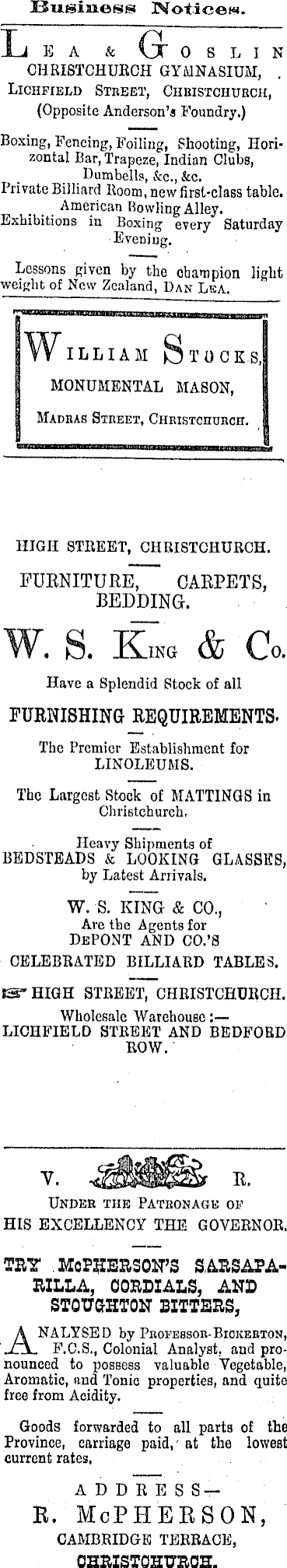 Business Notices. Lea & Gr o s li n CHRISTCHURCH GYMNASIUM, . Lichfield Street, Christchurch, (Opposite Anderson’s Foundry.) Boxing, Fencing, Foiling, Shooting, Horizontal Bar, Trapeze, Indian Clubs, Dumbells, &c., &c. Private Billiard Room, new first-class table. ... American Rowling Alley. Exhibitions in Boxing every Saturday Evening. Lessons given by the champion light weight of New Zealand, Dan Lea. llVilliam Stocks, MONUMENTAL MASON, Madras Street, Christchurch, HIGH STREET, CHRISTCHURCH. purnitureT” carpets, BEDDING. W. S. Km & Co. Have a Splendid Stock of all FURNISHING REQUIREMENTS. The Premier Establishment for LINOLEUMS. The Largest Stock of MATTINGS in Christchurch, Heavy Shipments of BEDSTEADS & LOOKING GLASSES, by Latest Arrivals. W. S. KING & CO., Are the Agents for DePONT AND CO.’S CELEBRATED BILLIARD TABLES. SSa" HIGH STREET, CHRISTCHURCH. Wholesale Warehouse:— LICHFIELD STREET AND BEDFORD ROW. Y. R. Under the Patronage of HIS EXCELLENCY THE GOVERNOR. TRY . MCPHERSON’S SARSAPARILLA, CORDIALS, AND STOUGHTON BITTERS, ANALYSE D by Professor-Biokeeton, F.C.S., Colonial Analyst, and pronounced to possess valuable Vegetable, Aromatic, and Tonic properties, and quite free from Acidity. Goods forwarded to all parts of the Province, carriage paid,' at the lowest current rates, ADDRESS—b. McPherson, CAMBRIDGE TERRACE, CHRISTCHURCH.