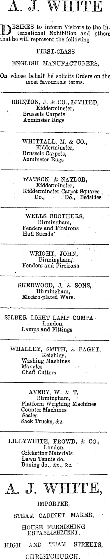 A. J WHITE DESIRES to inform Visitors to the International Exhibition and others that he will represent the following FIRST-CLASS ENGLISH MANUFACTURERS, On whose behalf he solicits Orders on the most favourable terms. BRINTON, J. & CO„ LIMITED, Kidderminster, Brussels Carpets Axminster Rugs WHITTALL, M. & 00., Kidderminster, Brussels Carpets, Axminster Rugs WATSON & NAYLOR, Kidderminster, Kidderminster Carpet Squares . Do,, Do., Bedsides WELLS BROTHERS, Birmingham, Fenders and Fireirons Hall Stands' WRIGHT. JOHN, Birmingham, Fenders and Fireirons SHERWOOD, J. & SONS, Birmingham, Electro-plated Ware. SILBER LIGHT LAMP COM PALondon, Lamps and Fittings WHALLEY, SMITH, & PAGET, Keighley, Washing Machines Mangles Chaff Cutters AVERY, W. & T. Birmingham, Platform Weighing Machines Counter Machines Scales Sack Trucks, &o. LILLYWHITE, FEOWD, & CO., London, Cricketing Materials Lawn Tennis do. Boxing do., &c., &o. A. J. WHITE, IMPORTER, STEAM CABINET MAKER, • HOUSE FURNISHING ESTABLISHMENT, HIGH AND TUAM STREETS, CHRISTCHURCH.