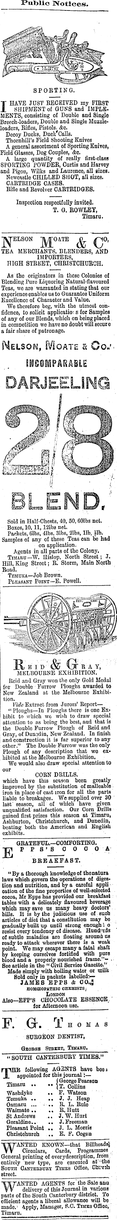 Public Notices. mmm VMJWI SPORTING. I HAVE JUST RECEIVED my FIRST SHIPMENT of GUNS and IMPLEMENTS, consisting of Double and Single Breech-loaders, Double and Single Muzzleloaders, Rifles, Pistols. &c. Decoy Ducks, Duck*Calls. Thornhill’s Field Shooting Knives A general assortment of Sporting Knives, Field Glasses, Dog Couples, &c. A large quantity of really first-class SPORTING POWDER, Curtis and Harvey and Pigou, Wilks and Laurence, all sizes. Newcastle CHILLED SHOT, all sizes. CARTRIDGE CASES. Rifle and Revolver CARTRIDGES. Inspection respectfully invited. T. G. ROWLEY, Timaru. JUGATE QO, TEA MERCHANTS, BLENDERS, AND IMPORTERS, HIGH STREET, CHRISTCHURCH. As the originators in these Colonies of Blending Pure Liquoring Natural-flavoured Teas, we are warranted in stating that our experience enables us to Guarantee Uniform Excellence of Character and Value, We therefore beg, with the utmost confidence, to solicit applicatio: s for Samples of any of our Blends, which on being placed, in comnetition we have no doubt will secure a fair share of patronage. Nelson, Moate r Co BNCOEtiPARABLE DARJEELING m BLEND, Sold in Half-Chests, 40, 50,601bs net. Boxes, 10,11,121bs net. Packets, 61bs, 41bs, 31bs, 21bs, lib, Hb. Samples of any of these Teas can he had on application. Agents in all parts of the Colony. TiMA.au—W. Hislop, North Street; J. Hill,King Street; R. Storm, Main North Road, Temuka— Job Brown. Pleasant Point—E. Powell. 2 o R e id ' & Gt r ay, MELBOURNE EXHIBITION. Reid and Gray won the only Gold Medal for Double Farrow Ploughs awarded to New Zealand at the Melbourne Exhibition. Vide Extract from Jurors’ Report—- “ Ploughs—ln Ploughs there is one Exhibit to which we wish to draw special attention to as being the best, and that is the Double Furrow Plough of Reid and Gray, of Dunedin, New Zealand. In finish and construction it is far superior to any other.” The Double Furrow was the only Plough of any description that we exhibited at the Melbourne Exhibition. _ We would also draw special attention to our i CORN DRILLS, which have this season been greatly improved by the substitution of malleable • iron in place of cast iron for all the parts liable to breakages. We supplied over 30 last'season, all of which have given unqualified satisfaction. Our Corn Drills gained first prizes this season at Timaru, Ashburton, Christchurch, and Dunedin, beating both the American and English exhibits. GRATEFUL.—COMFORTING. JgJ P P S• S 0 0 0 0 A BREAKFAST. "By a thorough knowledge of thonatara laws which govern the operations of digestion and nutrition, and by a careful appli cation of the fine properties of well-selected cocoa, Mr Epps has provided our breakfast : tables with a delicately flavoured beverage which may save ua many heavy doctors’ bills. It is by the judicious use of such articles of diet that a constitution may be gradually built up until strong enough 1 , o resist every tendency of disease. Hundreds of subtle maladies are floating around ns ready to attack wherever there is a weak point. We may escape many a fatal shaft by keeping ourselves fortified with pure blood and a properly nourished frame.”*- . See article in the " Civil Service Gazette.” Made simply with boiling water or milk Sold only in packets labelled;— JAMES EPPS & 00.,J HOMCEOPATHId CHEMISTS j London Also—EFP’S CHOCOLATE ESSENCE,' for Afternoon use. F. Gr. Thomas SURGEON DENTIST, Gsobgh Street, Timabu, " SOUTH CANTERBURY TIMES." THE following appointed for Timaru .. • Washdyke Temuka .. . Oamaru ... Waimate.. . St Andrews Geraldine.. Pleasant Point . Christchurch AGENTS have beoi this journal : (George Pearson * {T. Collins . F. Watson . J. J. Heap . R. L. Rule . R.Hutt . J.W. Hurt . J. Freeman , J. L. Morris . E. F. Oogon WANTED KNOWN—that Circulars, Cards, Programmes , General printing of everydesoription, from entirely new type, are executed at u thti South Oaktkbbuey Times Office, Oh'."rob street. 1 , WANTED AGENTS for the Sale ana delivery of this Journal in various parts of the South Canterbury district. To efficient agents a liberal allowance will ha made. 1 Apply, Manager, S.O. Times Office, Timaru. 1 ' 1,11 ' '