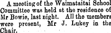 A meeting of the Waimataitai School Committee was held at the residence of Mr Bowie, last night. All the members were present, Mr J. Lukey in the Chair.