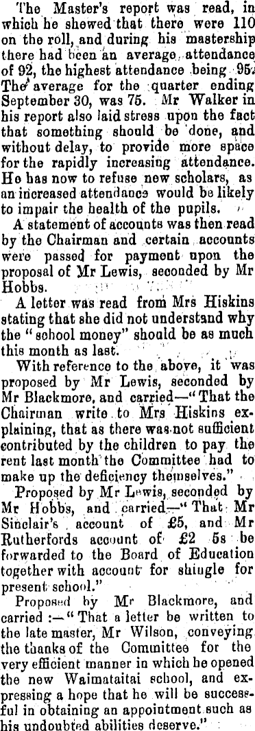 The, Master’s report was read, in which be shewed that there were 110 on the roll, and during his mastership there had been an average, attendance of 921, the highest attendance being 95v The/average for the ending September 30, was 75. Mr Walker in his report also laid stress upon the fact that something should be done, and without delay, to provide more space for the rapidly increasing attendance. Ho has now to refuse new scholars, as an iricreased attendance would be likely to impair the health of the pupils. ' A statement of accounts was then read: by the Chairman and certain, accounts were passed for payment upon the proposal of Mr Lewis, seconded by Mr Hobbs. ‘ A letter was read from Mrs Hiskins stating that she did not understand why the “ school money” should be as much this month as last. 1 , With reference to the above, it was proposed by Mr Lewis, seconded by Mr Blackmore, and carried —“That the Chairman write, to Mi's Hiskins explaining, that as there wasnot sufficient contributed by the children to pay the rent last month the Committee bad to' make up the deficiency themselves.” - Proposed by Mr Lewis, seconded by Mr Hobbs, and ! carried— 1 “ That; Mr Sinclair’s ’ account of £5, and Mr Rutherfords account of' £2 5s forwarded to the Board of Education together with account for shiugle for present school.” Proposed by Mr Blackmore, and carried “That a letter be written to the late master, Mr Wilson, conveying, the thanks of the Committee for the very efficient manner in which he opened the new Waimataitai school, and expressing a hope that he will be successful in obtaining an appointment.such as his undoubted abilities deserve.”