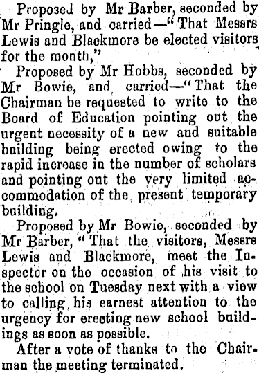 Proposed by Mr Barber, seconded by Mr Pringle, and carried—“ That Messrs Lewis and Blaokmore be elected visitors for the month,” Proposed by Mr Hobbs, seconded by Mr Bowie, and ( carried—“ That the Chairman be requested to write to the Board of Education pointing out the urgent necessity of a new and suitable building being erected owing to the rapid increase in the number of scholars and pointing out the very limited ap-. commodation of the, present temporary building. . - Proposed by Mr Bowie, seconded by, Mr Barber, “ That the visitors, Messrs Lewis and Blaokmore, meet the Inspecter on the occasion of his visit to the school on Tuesday next with a view to calling, bis earnest attention to the urgency for erecting new school buildings as soon as possible. After a vote of thanks to the Chairman the meeting terminated.