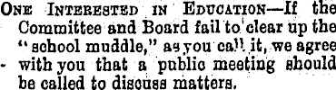 One Intbeested in Education— lf the Committee and Board fail to'clear Up the “ school muddle,” asyou call it, we agree • with you that a public meeting should be called to diaoUss matters.