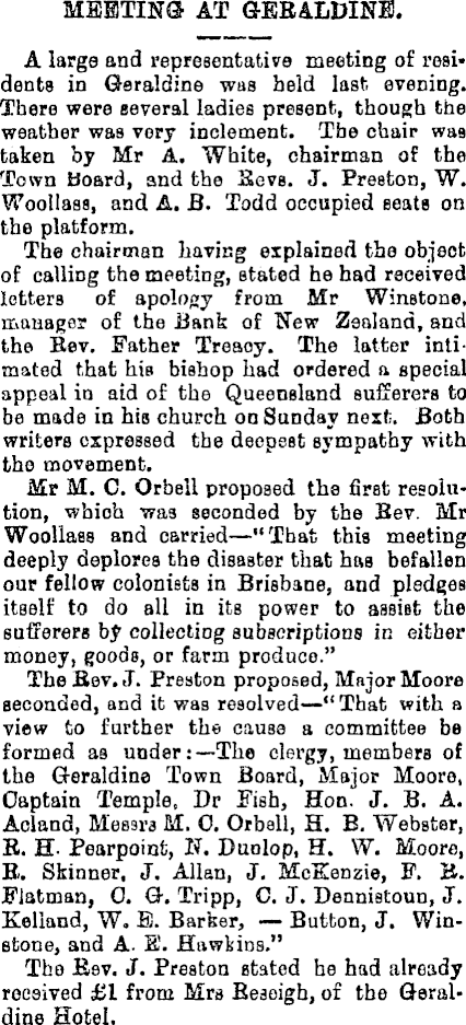 MS®TINS' AT GERALDINE. A large and representative meeting of residents in Geraldine was held last evening. There were several ladies present, though the weather was very inclement. The chair was taken by Mr A. White, chairman of the Town Board, and the Sevs. J. Preston, W. Woollaas, and A. B. Todd occupied seats on the platform. The chairman having explained the object of calling the meeting, stated he had received letters of apology from Mr Winstone, manager of the Bank of New Zealand, and the Bev. Father Treaoy. The latter intimated that his bishop had ordered a special appeal in aid of the Queensland sufferers to be made in his church on Sunday next. Both writers expressed the deepest sympathy with the movement. Mr M. C. Orbeil proposed the first resolution, wbioh was seconded by the Bev. Mr Wooliass and carried—“ That this meeting deeply deplores the disaster that has befallen our fellow colonists in Brisbane, and pledges itself to do all in its power to assist the sufferers by collecting subscriptions in either money, goods, or farm produce.” The Bev. J. Preston proposed, Major Moore seconded, and it was resolved—“ That with a view to further the causa a committee be formed as under:—The clergy, members of the Geraldine Town Board, Major Moore, Captain Temple, Dr Fish, Hon. J. B. A. Aoland, Messrs M. 0. Orball, H. B. Webster, B. H. Pearpoint, N. Dunlop, H. W. Moore, B. Skinner, J. Allan, J. McKenzie, P. B. Flatmaa, 0. G. Tripp, C. J. Dennistoun, J. Keliand, W. B. Barker, Button, J. Winstone, and A. E. Hawkins.” The Bev. J. Preston stated he had already received £1 from Mrs Eeaoigb, of the Geraldine Hotel.
