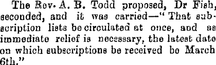 The Bov- A. B. Todd proposed, Dr Fish, seconded, and it was carried —“ That subscription lists be circulated at once, and as immediate relief is necessary, the latest date on which subscriptions be received bo March 6th,”