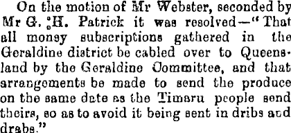 On the motion of Mr Webster, seconded by Mr G. ’H. Patrick it was resolved—” That all money subscriptions gathered in the Geraldine district be cabled over to Queensland by the Geraldine Committee, and that arrangements be made to send the produce on the same date as the Timaru people send theirs, so as to avoid it being sent in dribs and drabs”