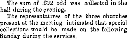 The sum of £32 odd was collected in the hall during the evening. The representatives of the three churches present at the meeting intimated that special collections would be made on the following Sunday during the services: