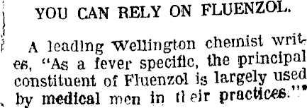 YOU CAN RELY ON FLUENZOL. A leading Wellington chemist writes, "As a fever specific, the principal constituent of Fluenzol is largely used by medical men in tl eir practice.