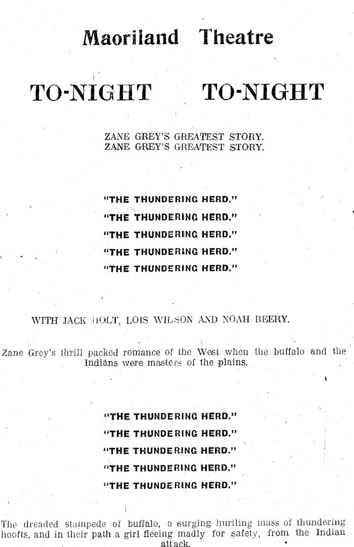 Maori land Theatre TO-NIGHT TONIGHT ZANE GREY'S GREATEST STORY. ZANE GRiEY'S GREATEST STORY. "THE THUNDERING HERD." "THE THUNDERING HERD." "THE THUNDERING HERD." "THE THUNDERING HERD." "THE THUNDERING HERD." WITH JACK MOLT LOIS WILSON AND NOAH BEERY. Zane Grey's thrill packed romance of the Wast when the .buffalo and the Indians were masters of the plains. "THE THUNDERING HERD." "THE THUNDERING HERD." "THE THUNDERING HERD." "THE THUNDERING HERD." "THE THUNDERING HERD." The dreaded stampede of buffalo, a surging hurtling mass of thundering hoofts, and in their path a girl fleeing madly for safety, from the Indian attack.