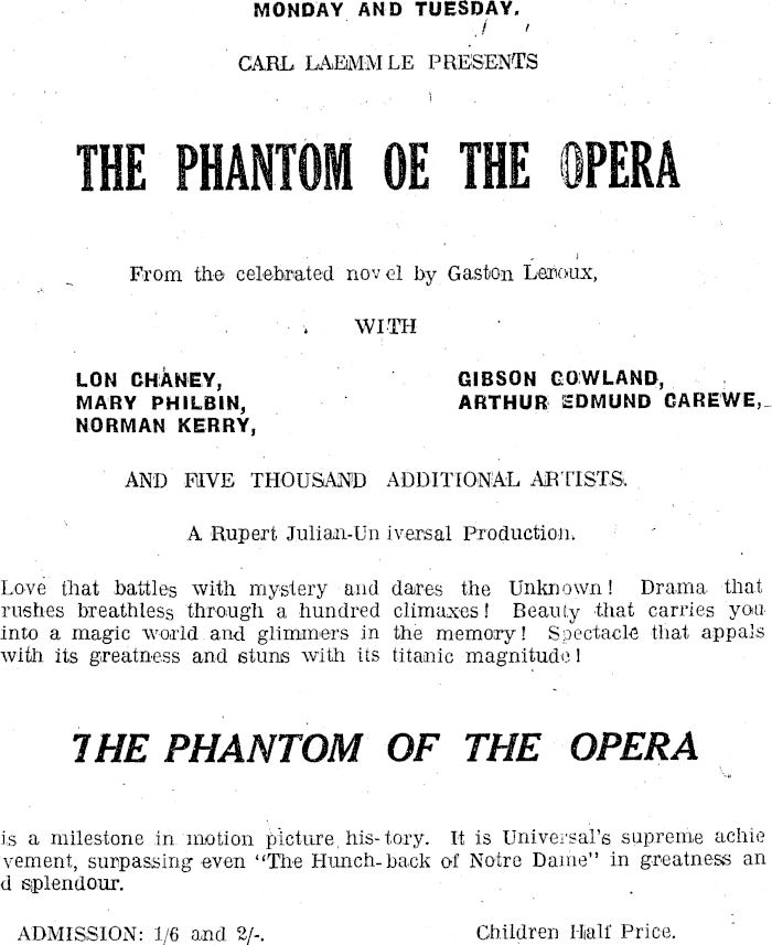 MONDAY AND TUESDAY. CARL LAEMMLE PRESENTS THE PHANTOM OE THE OPERA From the celebrated novel by Gaston Lenoux, WITH LON CKANEY, MARY PHILBIN, NORMAN KERRY, GIBSON COWLAND, ARTHUR EDMUND CAREWE, AND RIVE THOUSAND ADDITIONAL ARTISTS. A Rupert Julian-Universal Production, Love that battles with mystery and dares the Unknown! Drama that rushes breathless through a hundred climaxes! Beauty that carries you into a magic world.and glimmers in the memory! Spectacle that appals with its greatness and stuns with its titanic magnitude 1 THE PHANTOM OF THE OPERA is a milestone in motion picture, his-tory. It is Universale supreme achie vement, surpassing even "The Hunch-hack of Notre Dame" in greatness an d splendour. ADMISSION: 1/6 and 2/-. Children Mali' Price.
