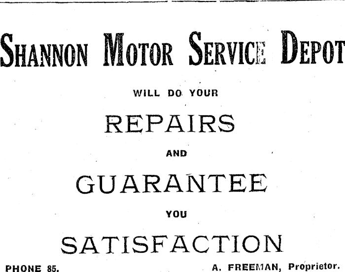 Shannon Motor Service Depot WILL DO YOUR aalara PHONE 85. A, FREEMAN, Proprietor.