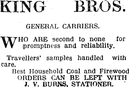 GENERAL CARRIERS. 7HO ARE second to none for » / promptness and reliability. Travellers' samples handled with care. Best Household Coal and Firewood ORDERS CAN BE LEFT WITH J. V. BURNS, STATIONER.