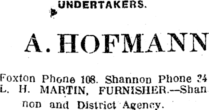 UNDERTAKERS. Foxton Phone 108. Shannon Phone ?4 L. H. MARTIN, FURNISHER.—Shannon and District Agency.