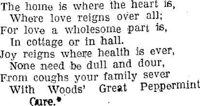 The home is where the heart is, Where love reigns over all; For love a wholesome part is, Tn cottage or in hall. Joy reigns wheape health is ever, None need be dull and dour, From coughs your family sever _ With Woods' Great Peppermint Cure.*