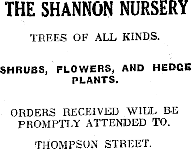 THE SHANNON NURSERY TREES OF ALL KINDS. SHRUBS, FLOWERS, AND HEDGE PLANTS. ORDERS RECEIVED WILL BE PROMPTLY ATTENDED TO. THOMPSON STREET.