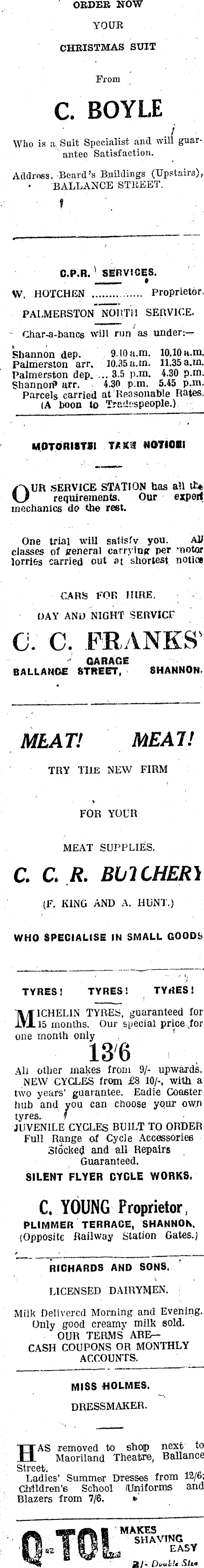 ORDER NOW YOUR CHRISTMAS SUIT From C. BOYLE I Who is a. Suit Specialist aiid will guarantee Satisfaction. Address. Beard’s Buildings (Upstairs), BALLANCE STREET. f G.P.R. ' SERVICES. W. HOTCHEN Proprietor. palmerston" north service. - Char-a-bancs will run as under:— Shannon dep. 9.10 a.m. 10.10a.ra. Palmerston arr. 10.35 a.m. 11.35 a.m. Palmerston dep. ... 3.5 p.m. 4.30 p.m. Shannorf* arr. 4.30 p:m. 5.45 p.m. Parcels carried at Reasonable Rates. (A boon to Tradespeople.) MOTORISTS! . TAX 9 NOTIOBI OUR SERVICE STATION has all tie requirements. Our expert nechanics do the rest. One trial will satisfy you. All classes of general carrying per motor lorries carried out at shortest notice CARS FOR HIRE. DAY AND NIGHT SERVICE C. C. .PRANKS' • GARAGE BALLANGE STREET, SHANNON. MEAT! MEAT! TRY THE NEW FIRM ’ % FOR YOUR MEAT SUPPLIES. C. C. R. BbICHER'i (F. KING AND A. HUNT.) WHO SPECIALISE IN SMALL GOODS TYRES! TYRES! TYRES! MICHELIN TYRES, guaranteed for 15 months. Our special price t for one month only . f 136 All other makes from 9/- upwards. NEW CYCLES from £8 10/-, with a two years’ guarantee. Eadie Coaster hub and you can choose your own tyres.. f JUVENILE CYCLES BUILT TO ORDER Full Range of Cycle Accessories Stocked and all Repairs Guaranteed. SILENT FLYER CYCLE WORKS. C. YOUNG Proprietor, PLIMMER TERRACE, SHANNOK, {Opposite Railway Station Gates.) RICHARDS AND SONS. LICENSED DAIRYMEN. Milk Delivered Morning and Evening. Only good creamy milk sold. OUR TERMS ARECASH COUPONS OR MONTHLY ACCOUNTS. MISS HOLMES. DRESSMAKER. HAS removed to shop next to Maoriland Theatre, Ballance Street. Ladies’ Summer Dresses from 12/6; Children's School (Uniforms and Blazers from 7/6. *> MAKES SHAVING EASY ''Stf-'DeutU Six*