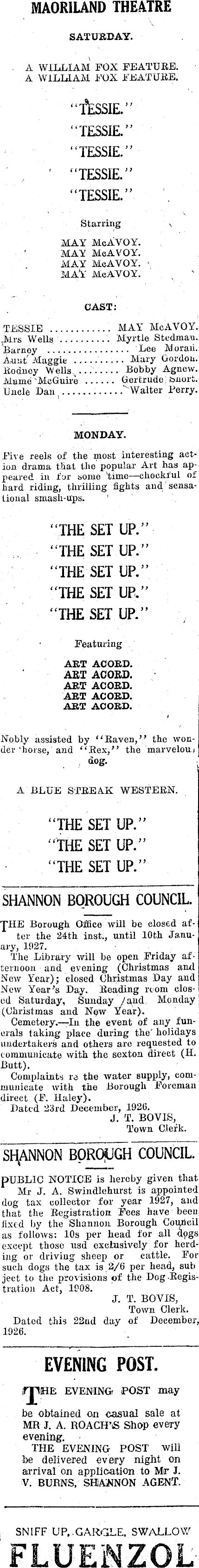 MAORILAND THEATRE SATURDAY. A WILLIAM FOX FEATURE. A WILLIAM FOX FEATURE. “TESSIE.” “TESSIE.” “TESSIE.” ' “TESSIE.” “TESSIE.” Starring % MAY Me AVO Y. ' MAY McAVOY. MAY McAVOY. A MAA McAVOY. CAST: TESSIE MAY McAVOY. Mrs Wells . Myrtle Steelman. Barney Lee Moraii. Aunt* Maggie .......... Mary Gordon. Rodney Wells, ........ Bobby Agnew. Maine 'McGuire ...... Gertrude: fonort. Uncle Ban ( '"Walter Ferry. MONDAY. Five reels of the most interesting action drama that the popular Art has appeared in for some 'time—cliockful of hard riding, thrilling fights and. sensational smash-ups. 1 “THE SET UP.” “THE SET UP.” “THE SET UP.” “THE SET UP.” “THE SET UP.” Featuring ART ACORD. ART ACORD. ART ACORD. ART ACORD. ART ACORD. Nobly assisted by “Raven,” the wonder'horse, and “Rex,” the marvelou.j u°g. A BLUE STREAK WESTERN. “THE SET UP.” “THE SET UP.” “THE SET UP.” SHANNON BOROUGH COUNCIL. "pHE Borough Office will be closed after the 24th inst., until 10th January, 1927. The Library will be open Friday afternoon and evening (Christmas and New Year); closed Christmas Bay and New Year's Day. Reading room closed Saturday, Sunday /and, Monday (Christmas and Year). Cemetery.—ln the event of any funerals taking place during the' holidays undertakers and others are requested to communicate with the sexton direct (H. Butt). Complaints re the water supply, communicate with the Borough Foreman direct (F. Haley). Dated 23rd December, 1926. J. T. BOVIS, Town Clerk. SHANNON BOROUGH COUNCIL. PUBLIC NOTICE is hereby given that Mr J. A. Swindlehurst is appointed dog tax collector for year 1927, and that the Registration Fees have been fixed by the Shannon Borough Coiuicil as follows: 10s per head for all dpgs except those usd exclusively for herding or driving sheep or cattle. For such dogs the tax is 2/6 per head, sub jeet to the provisions of the Dog Registration Act, 1908. J. T. BOVIS, Town Clerk. Dated this 22nd day of December, 1926. EVENING POST. ifJVHE EVENING POST may be obtained on casual sale at MR J. A. ROACH’S Shop every evening. THE EVENING POST will be delivered every night on arrival on application to Mr J. V. BURNS, SHANNON AGENT. SNIFF UP,.GARGLE. SWALLOW FLUENZOL