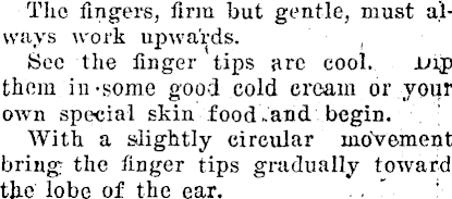 The fingers, firm but gentle, must always work upwards. ( Sec the finger tips arc cool. .Dip them in-some good cold cream or your OAvn special skin food/and begin. ’ With a slightly circular movement bring the finger tips gradually toward the lobe of the ear. ~ " ;