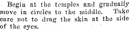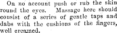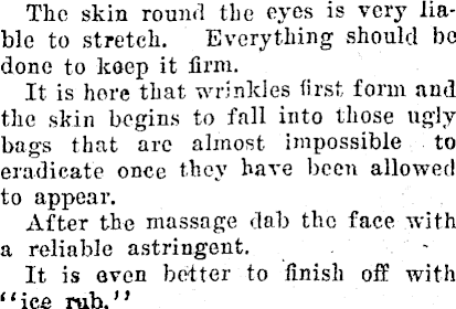 The skin round the eyes is very liable to stretch. Everything should bo done to keep it firm. It is horc that wrinkles first form and the skin begins to fall into those ugly bags that are almost impossible to eradicate once they have been allowed to appear. After the massage dab the face with a reliable astringent. - It is even better to finish off with “ice rub. M