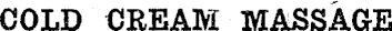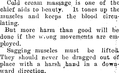 Cold cream massage is one of the ehief aids to beauty. It tones up the muscles and keeps the blood circulating. But more harm than good will be done if the wrung movements are employed. Sagging muscles must be lifted. They should never be dragged out of place with a harsh hand in a downward direction.