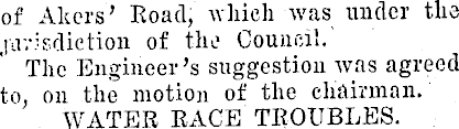 of Akers’ Road, which was under the jurisdiction of the Council. The Engineer’s suggestion was agreed to, on the motion of the chairman. WATER RACE TROUBLES.