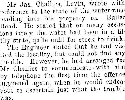 Mr Jas. Challies, Levin, wrote with reference to the state of the water-race leading into his property on Buller Road. He stated that on many occasions lately the water had been in a filthy state, quite unfit for stock to drink. The Engineer stated that he had visited the locality, but could not find any trouble. However, he had arranged for Mr Challies to communicate with him by telephone the first time the offence happened again, when he would endeavour to ascertain just what the troublcwas.