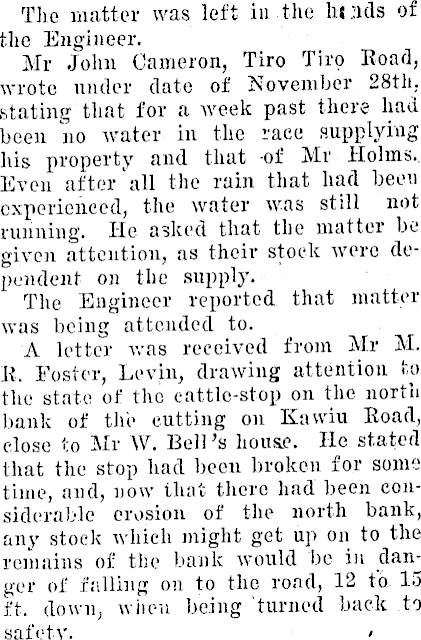 The matter was left in the lu lids of the Engineer. Mr John Cameron, Tiro Tirp Road, wrote under date of November 28th, stating that for a week past there had been no water in the race supplying his property and that of Mr Holms.. Even after all the rain that had been experienced, the water was still not running. He asked that the matter be given attention, as their stock w r ere dependent on the supply. The Engineer reported that matter was being attended to. A letter was received from Mr M. E, Foster, Levin, drawing attention to the state of the cattle-stop on the north bank of the cutting on Kawiu Road, close to Mr W. Bell's house. He stated that the stop had been broken for some time, and, now that there had been considerable erosion of the north bank, any stock which might get up on to the remains of the bank would be in danger of railing on to the road, 12 to 15 ft. down, when being turned back to safety. >