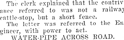 The clerk explained that the contrivance referred to eras not a railway cattle-stop, but a short fence. Tlie letter was referred to the En eincer, with' power to act. WATER-PIPE ACROSS ROAD.