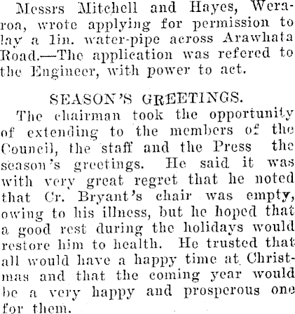 Messrs Mitchell and Hayes, Weraroa, wrote applying for permission to lay a lin. water-pipe across Arawhata Road. —The application was refered to the Engineer, with power to act. SEASON’S GREETINGS. The chairman took the opportunity of ex ten fling to the members of the Council, the staff and the Press the season’s greetings. He said it was Avith very great regret that he noted that Cr.' Bryant’s chair Avas empty, owing to his illness, but lie hoped that a good rest during the holidays Avould restore him to health. He trusted that all Avould have a happy time at Christmas and that tlie coming year Avould be a very happy and prosperous one for them.