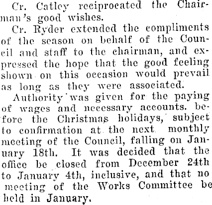 Cr. Cat-ley reciprocated the Chairman ’s good Avishes. Cr. Ryder extended t-lie compliments of the season on behalf of the Council and staff to the chairman, and expressed the hope that the good feeling shown on this occasion Avould pre\ r ail as long as they AA T ere associated. Authority Avas given for the paying of Avages and necessary accounts, before the Christmas holidays,' subject to confirmation at the next monthly meeting of the Council, falling on January 18th. It Avas decided that the office be closed from December 24th to January 4th, inclusive, and that no meeting of the Works Committee be held in January.
