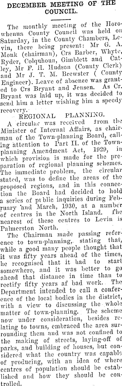 DECEMBER MEETING OF THE COUNCIL. The monthly meeting of the Horowlienua County Council was held on Saturday, in the County Chambers, Levin, there being present: Mr G. a. Monk (chairman), Crs Barber, Whyte, Rvder, Colquhoun, Gimblett-and ULIcv Mr F. 11. Hudson (County Clenc) and Mr J. T, M. Brewster ( County Engineer)- Leave of absence was granted to Crs Bryant and Jensen. As Ur. Bryant was laid up, it was decided to send him a letter wishing him a speedy ICCO ' C REGIONAL PLANNING. A circular was received from t-lio Minister of Internal Affairs, as chairman of the Town-planning Board, calling attention to Part 11. of the Townplanning Amendment Act, 1929, m which provision is made for the preparation of regional planning schemes. The immediate problem, the circulai stated, was to define the areas of the proposed regions, and in this connection the Board had decided to hold a series of piblic inquiries during February and March, 1930, at a number of centres in the North Island. ihe nearest of these centres to Lei’in is Palmerston North. ' . The Chairman made passing reference to town-planning,, stating that, while a good many people thought that it was fifty years ahead of the times, he recognised that it had to stait somewhere, and it was better to go ahead that distance in time than to rectify fifty years af bad work. The Department intended to call a conference of the local bodies in the district, with a view to discussing the whole matter of town-planning.. The. scheme now under consideration, besides relating to towns, embraced the area surrounding them and was not confined to the making of streets, laying-off of parks, and building of houses, but considered what the country’ was capable of producing, with an idea of where centres of population should be established and how they should be controlled.