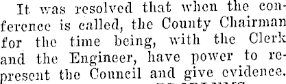 It was resolved that when the conference is called, the County Chairman for the time being, with the Clerk and the Engineer, have power to represent the Council and give evidence