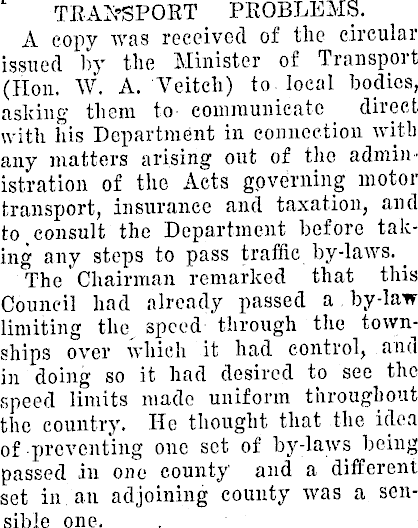 TRANSPORT PROBLEMS. A copy was received of the circular issued by the Minister of Transport (Hon. W. A. Veitch) to local bodies, ashing them to- communicate direct with liis Department in connection with any matters arising out of the administration of the Acts governing motor transport, insurance and taxation, and to consult the Department before taking any steps to pass traffic by-laws. _ The' Chairman remarked that this Council had already passed a by-law limiting the speed through the townships over which it had control, ana in doing so it had desired to see the speed limits made uniform throughout the country. He thought that the idea of preventing one set of by-laws being passed in one county and a different set in an adjoining county was a sensible one.