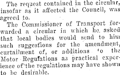 The request contained in the circular, insofar as it affected the Council, was agreed to. The Commissioner of Transport forwarded a circular in which lie. asked that local bodies would send to him such suggestions for the amendment, curtailment of, or additions + o the Motor ■ Regulations as practical experience of tlie regulations may have shown to be desirable.