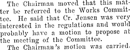 The Chairman moved that this matter be referred to the Works Committee. He said that Cr. Jensen was very interested in the regulations and would probably huA’c a motion to propose at the meeting of the Committee. The Chairman’s motion Avas carried-