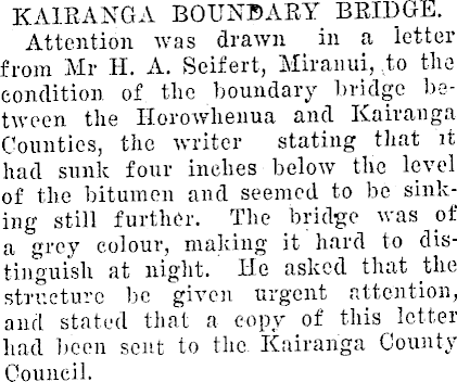KAIRANGA BOUNDARY BRIDGE. Attention Avas draAvn _ in a letter from Mr H. A. Seifert, Miranui, to the condition of the boundary bridge betAveen the HoroAvhenua and Kaivanga Counties, the Avriter stating that it had sunk four inches beloAV the level of the bitumen and seemed to be sinking still further. The bridge Avas of a grey colour, making it hard to distinguish at night. He asked that Hie structure be given urgent attention, and stated that a copy of this letter had been sent to the Kairanga County Council.