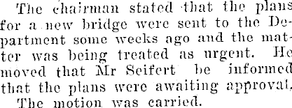 The chairman stated -that the plans for a.ncAV bridge Averc sent to the Department some weeks ago and the matter was being treated as urgent. He moved that Mr Seifert be informed that the plans were awaiting approval, The motion Avas carried.