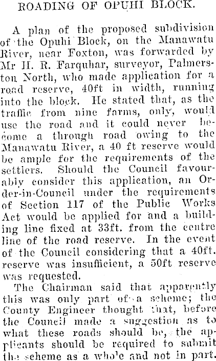 ROADING OF OPUHI BLOCK. A plan of the proposed subdivision of the Opulii Block, on the ManaAvatu River, near Foxton, Avas fonvnrded by Mr 11. R. Farquhar, surveyor, Palmerston North, Avho made .application for a road reserve, 40ft in Avidtli, running into the block. He stated that, as the traffic from nine farms, only, would use the road and it could noA'er liecome a through road oAving to the ManaAvatu River, a 40 ft reserve Avould be ample for the requirements of tlie settlers. Should the Council favourably consider this application, an Or-der-in-Council under tlie requirements of Section 117 of the Public Works Act Avould be applied for and a building line fixed at 33ft. from the centre line of the road reserve. In the event of the Council considering that a 40ft. reserve Avas insufficient, a 50ft reserve was requested. The Chairman said that apparently this Avas only part of -a scheme; Hie County Engineer thought '.uat, before the Council made a suggestion as to what these roads should be, the applicants should be required to submit tlie scheme as a Avho’e and not in part.