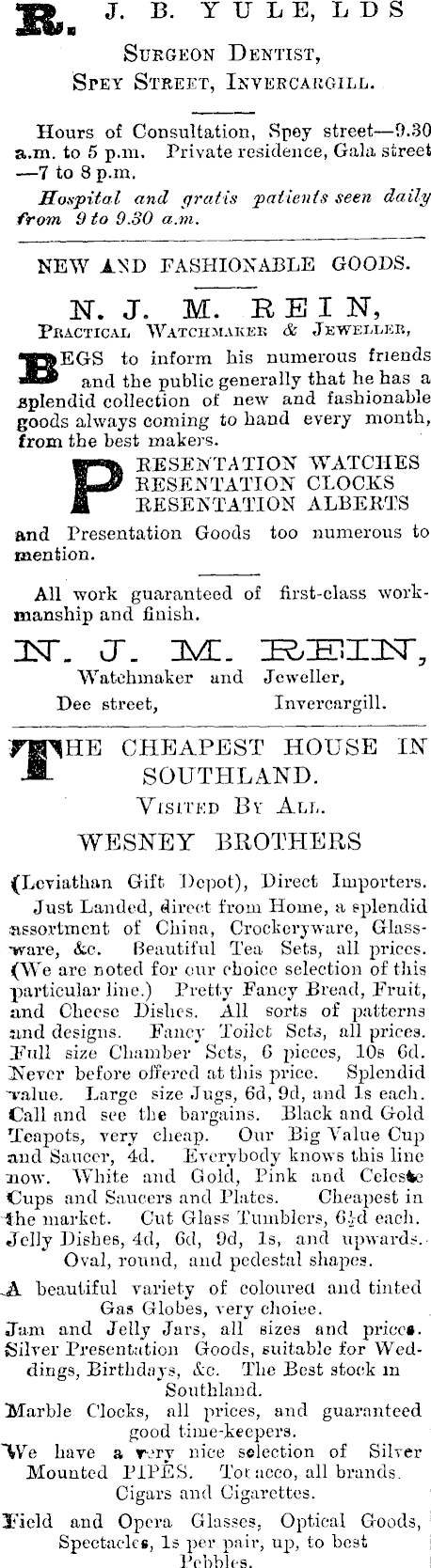 B. J. B. Y U LE, LD S Surgeon Dentist, Spet Street, Invercargill. Hours of Consultation, Spey street—9.Bo a.m. to 5 p.m. Private residence, Gala street —7 to 8 p.m. Hospital and gratis patients seen daily from 9to 9.30 a.m. NEW AND FASHIONABLE GOODS. N. J. M. RBI N, Practical Watchmaker & Jeweller, BEGS to inform his numerous friends and the public generally that he has a isplendid collection of new and fashionable goods always coming to hand every month, from the best makers. PRESENTATION WATCHES EESENTATION CLOCKS EESENTATION ALBERTS and Presentation Goods too numerous to mention. All work guaranteed of first-class workmanship and finish. isr. cr. xk. "Watchmaker and Jeweller, Dee street, Invercargill. The cheapest house m SOUTHLAND. Visited Bv All. WESNEY BROTHERS (Leviathan Gift Depot), Direct Importers. Just Landed, direct from Home, a splendid assortment of China, Crockeryware, Glassware, Ac. Beautiful Tea Sets, all prices. (We are noted for our choice selection of this particular line.) Pretty Fancy Bread, Emit, and Cheese Dishes. All sorts of patterns and designs. Fancy Toilet Sets, all prices. Full size Chamber Sets, 6 pieces, 10s 6d. Never before offered at this price. Splendid -value. Large size Jugs, 6d, 9d, and Is each. Cali and see the bargains. Black and Gold Teapots, very cheap. Our Big Value Cup and Saucer, 4d. Everybody knows this line mow. "White and Gold, Pink and Celcsie Cups and Saucers and Plates. Cheapest in ~fhe market. Cut Glass Tumblers, G.Vd each. Jelly Dishes, 4d, Gd, 9d, Is, and upwards. Oval, round, and pedestal shapes. A. beautiful variety of coloured and tinted Gas Globes, very choice. Jam and Jelly Jars, all sizes and price#. Silver Presentation Goods, suitable for Weddings, Birthdays, &c. The Best stock m Southland. Marble Clocks, all prices, and guaranteed good time-keepers. "We have a very nice selection of Silver Mounted PIPES. Tocacco, all brands. Cigars and Cigarettes. 3?ield and Opera Glasses, Optical Goods, Spectacles, Is per pair, up, to best Pebbles.
