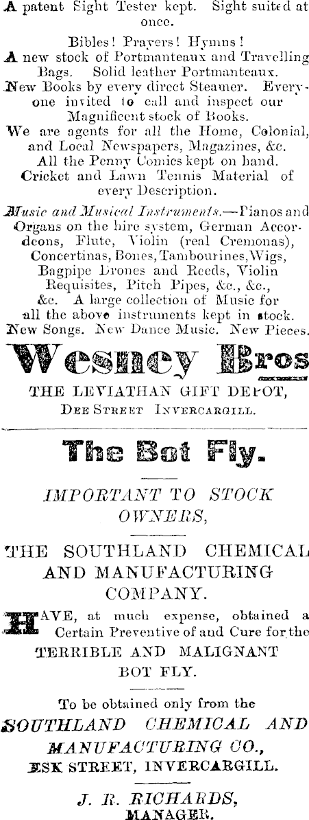 A patent Sight Tester kept. Sight suited at once. Bibles! Prayers ! Hymns ! A new stock of Portmanteaux and Travelling Bags. Solid leather Portmanteaux. JNew Books by every direct Steamer. Everyone invited to call and inspect our Magnificent stock of P>ooks. We are agents for all the Home, Colonial, and Local Newspapers, Magazines, &c. All the Penny Comics kept on hand. Cricket and Lawn Tennis Material of every Description. Music and Musical Instruments. —Pianos and Organs on the hire system, German Accordeons, Pluto, Violin (real Cremonas), Concertinas, Bones,Tambourines,Wigs, Bagpipe Drones and Eceds, Violin Requisites, Pitch Pipes, &c., &c., &c. A large collection of Music for all the above instruments kept in stock. Slew Songs. New Dance Music. New Pieces. Wesiey Uros THE LEVIATHAN GIFT DEPOT, Deb Stkeet Ixvekcaegiel. The But Fly. IMPORTANT TO STOCK OWNERS, ♦THE SOUTHLAND CHEMICAL AND MANUEACTURINGCOMTANY. ■'WAVE, at much expense, obtained a .igSifti Certain Preventive of and Cure for the TERRIBLE AND MALIGNANT BOT FLY. To be obtained only from the SOUTHLAND CHEMICAL AND MAN V FAG TUBING GO., JCSK STREET, INVERCARGILL. J. R. NIGH AIDS, MANAGER.