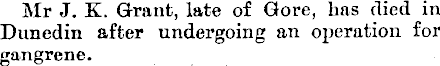 Mr J. K. Grant, late of Gore, has died in Dunedin after undergoing an operation for gangrene.