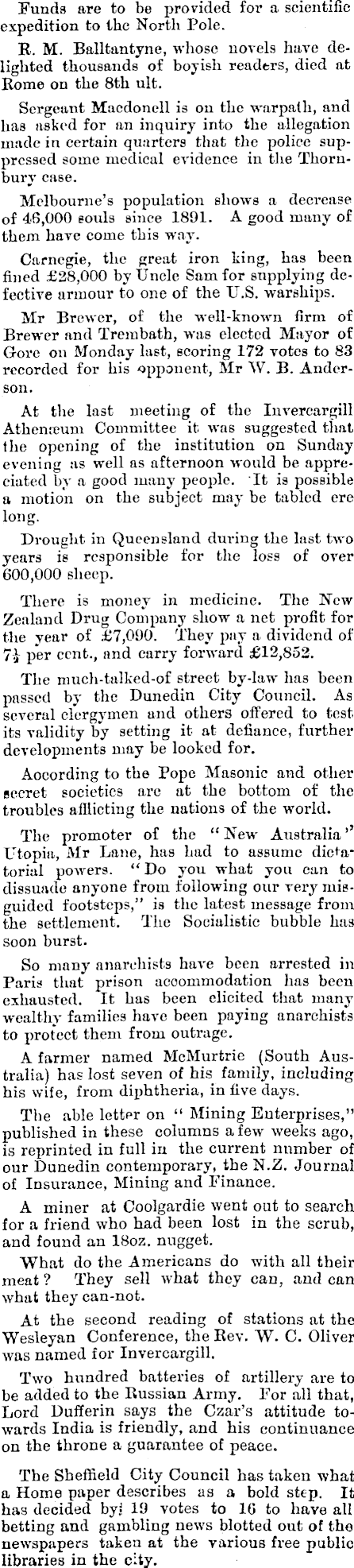 Funds are to be provided for a scientific expedition to the North Pole. R. M. Balltantyne, whoso novels have delighted thousands of boyish readers, died at Rome on the Bth ult. Sergeant Macdonell is on the warpath, and has asked for an inquiry into the allegation made in certain quarters that the police suppressed some medical evidence in the Thornbury case. Melbourne’s population shows a decrease of 46,000 souls since 1891. A good many of them have come this way. Carnegie, the great iron king, has been fined £28,000 by Uncle Sam for supplying defective armour to one of the U.S. warships. Mr Brewer, of the well-known firm of Brewer and Trembath, was elected Mayor of Gore on Monday last, scoring 172 votes to 83 recorded for his opponent, Mr W. B. Anderson. At the last meeting of the Invercargill Athenreum Committee it was suggested that the opening of the institution on Sunday evening as well as afternoon would be appreciated by a good many people. It is possible a motion on the subject may be tabled ere long. Drought in Queensland during the last two years is responsible for the loss of over 600,000 sheep. There is money in medicine. The New Zealand Drug Company show a net profit for the year of £7,090. They pay a dividend of 71 per cent., and carry forward £12,852. The much-talked-of street by-law has been passed by the Dunedin City Council. As several clergymen and others offered to test its validity by setting it at defiance, further developments may be looked for. According to the Pope Masonic and other secret societies arc at the bottom of the troubles afflicting the nations of the world. The promoter of the “ New Australia ’’ Utopia, Mr Lane, has had to assume dictatorial powers. “Do you what you can to dissuade anyone from following our very misguided footsteps,” is the latest message from the settlement. The Socialistic bubble has soon burst. So many anarchists have been arrested in Paris that prison accommodation has been exhausted. It has been elicited that many wealthy families have been paying anarchists to protect them from outrage. A farmer named McMurtrie (South Australia) has lost seven of his family, including his wife, from diphtheria, in five days. The able letter on “ Mining Enterprises,” published in these columns a few weeks ago, is reprinted in full in the current number of our Dunedin contemporary, the N.Z. Journal of Insurance, Mining and Finance. A miner at Ooolgardie went out to search for a friend who had been lost in the scrub, and found an 18oz. nugget. What do the Americans do with all their meat ? They sell what they can, and can what they can-not. At the second reading of stations at the Wesleyan Conference, the Rev. W. C. Oliver was named for Invercargill. Two hundred batteries of artillery are to be added to the Russian Army. For all that, Lord Dufferin says the Czar’s attitude towards India is friendly, and his continuance on the throne a guarantee of peace. The Sheffield City Council has taken what a Home paper describes as a bold step. It has decided by- 19 votes to 16 to have all betting and gambling news blotted out of the newspapers takea at the various free public libraries in the city.